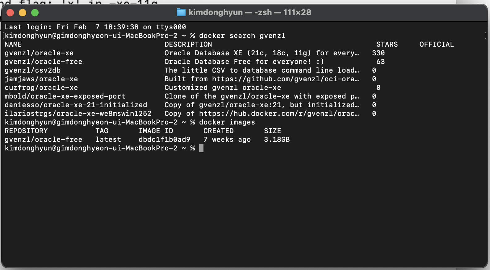 ์•„๋ž˜์™€ ๊ฐ™์ด REPOSITORY, TAG ์•„๋ž˜ ์ค„์— gvenzl/oracle-free๊ฐ€ ์žˆ๋‹ค๋ฉด ์„ฑ๊ณต์ ์œผ๋กœ ๋‹ค์šด์ด ๋˜์–ด ์žˆ๋Š” ๊ฒƒ์ด๋‹ค.