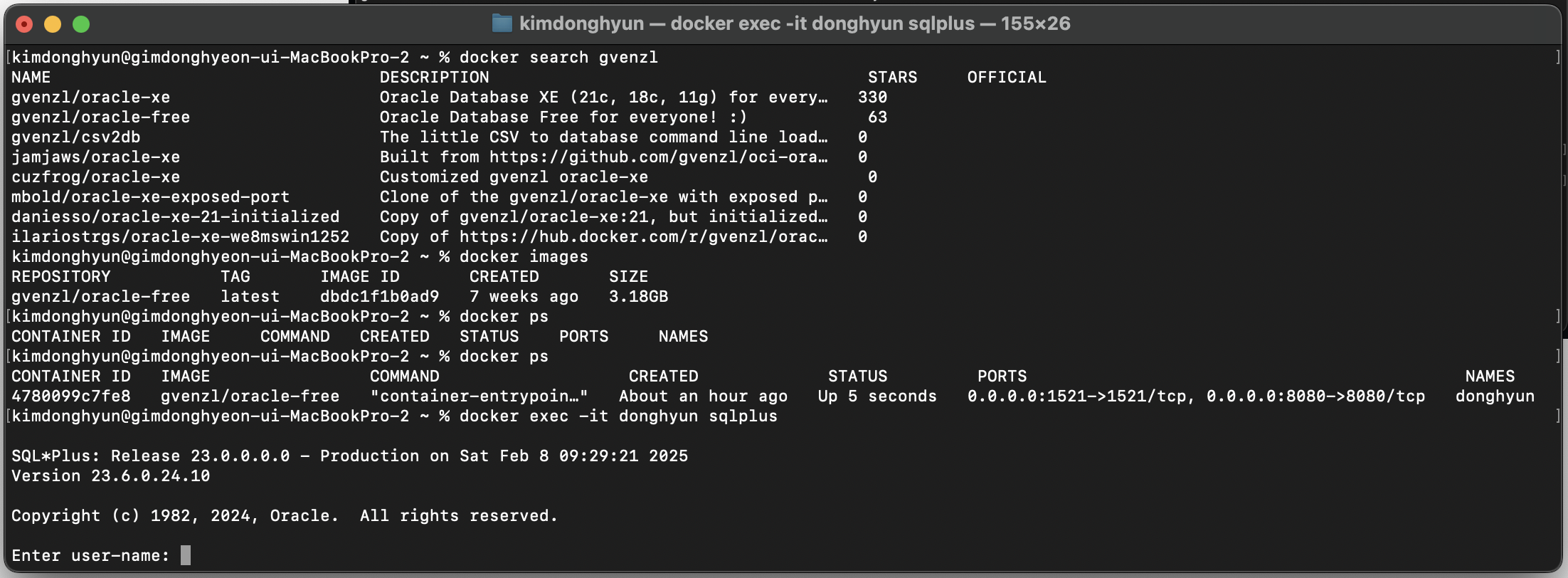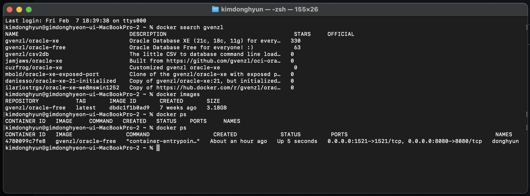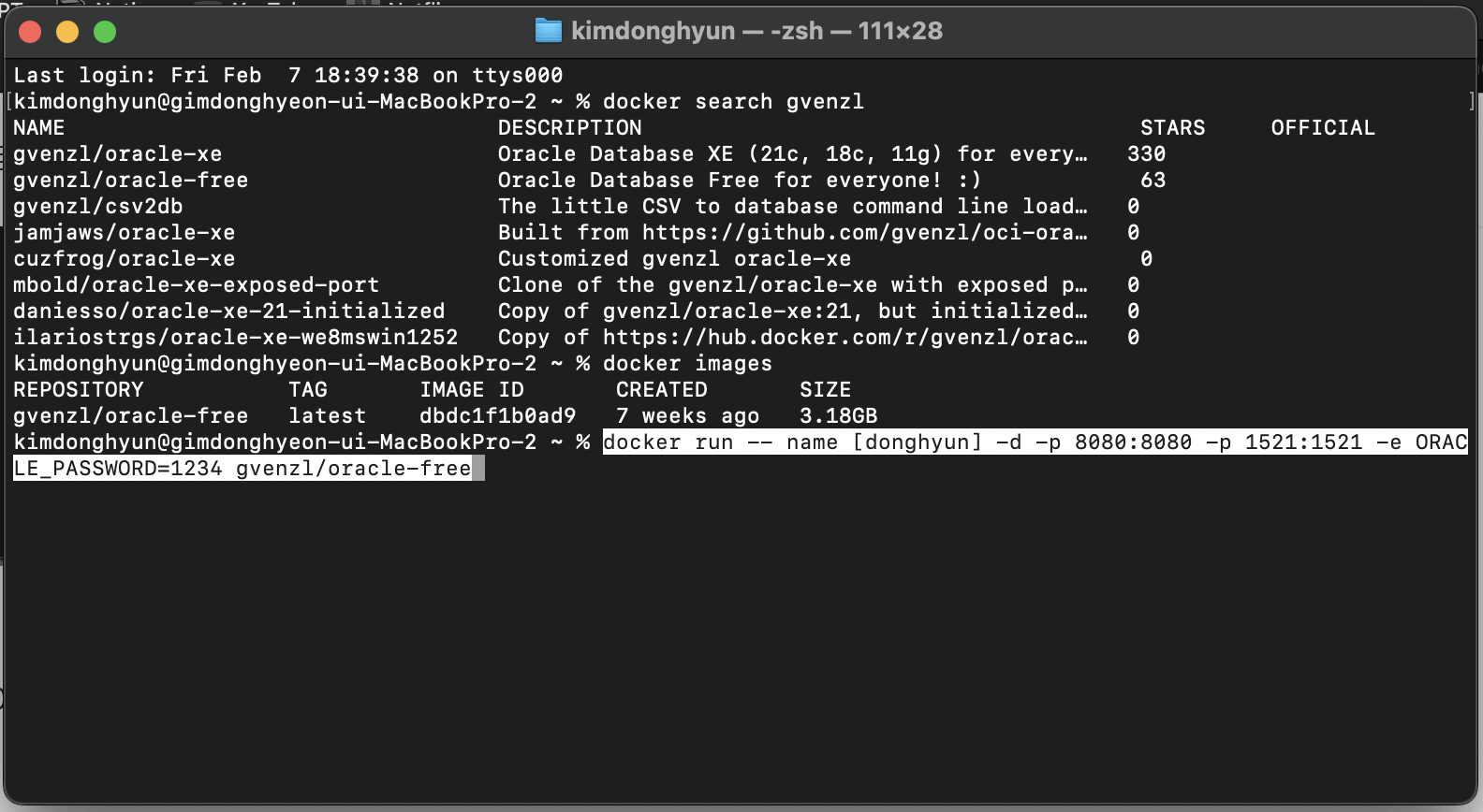 ๋ช…๋ น์–ด :docker run -- name [donghyun] -d -p 8080:8080 -p 1521:1521 -e ORACLE_PASSWORD=1234 gvenzl/oracle-free