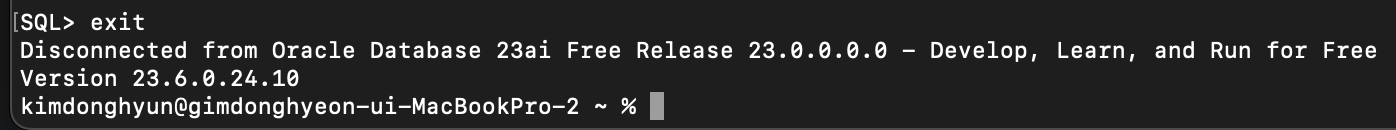๋‹ค์‹œ ๋งˆ์ง€๋ง‰ SQL> ๋ถ€๋ถ„์— exit๋ฅผ ์ณ์„œ ์•„๋ž˜์™€ ๊ฐ™์ด ์ข…๋ฃŒ๋œ๋‹ค๋ฉด Docker ์„ค์น˜์— ์„ฑ๊ณตํ•œ ๊ฒƒ์ด๋‹ค!
