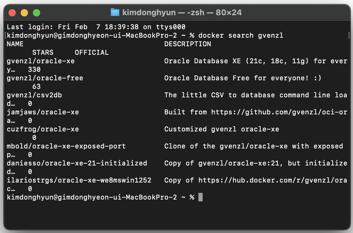 ๋ช…๋ น์–ด๋ฅผ ์ž…๋ ฅํ•˜๋ฉด gvenzl์ด ํฌํ•จ๋œ ์ด๋ฏธ์ง€ ๋ชฉ๋ก์ด ์•„๋ž˜์™€ ๊ฐ™์ด ์ถœ๋ ฅ๋œ๋‹ค.